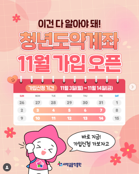 서민금융진흥원은 11월 3일부터 14일까지 청년도약계좌 11월 가입신청을 받는다고 29일 밝혔다. 청년도약계좌는 청년의 중장기 자산형성을 지원하는 적금상품으로, 만기 5년 동안 매월 최대 70만 원까지 자유롭게 납입하면 정부가 월 납입액에 비례해 기여금을 추가로 지급한다. 만기 시에는 은행 이자(금리 4.5~6.0%)와 비과세 혜택도 제공된다. 신청은 국민·신한·하나·우리·농협·기업·부산·iM뱅크(구 대구은행)·광주·전북·경남은행 등 11개 은행 앱을 통해 가능하다. 이번에 가입대상으로 안내받은 1인 가구는 11월 20일(목)부터 12월 12일(금)까지, 2인 이상 가구는 12월 1일(월)부터 12일(금)까지 영업일에 한해 계좌를 개설할 수 있다.